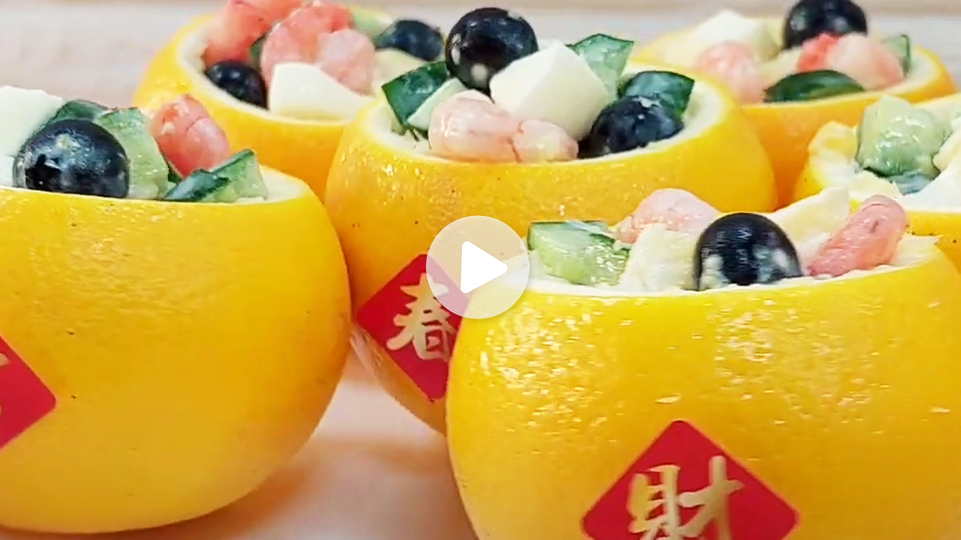 將拌勻的沙拉裝進柳丁盅即完成