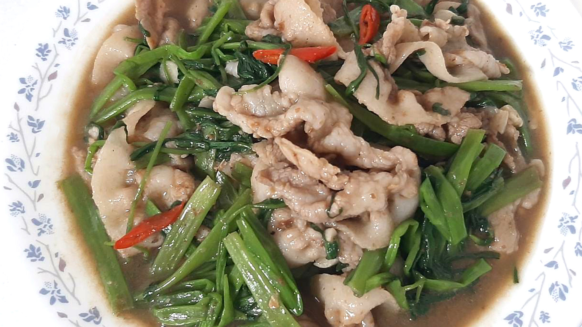 加入空心菜葉、沙茶、鹽調味,再加入肉片,快速拌炒至熟即完成